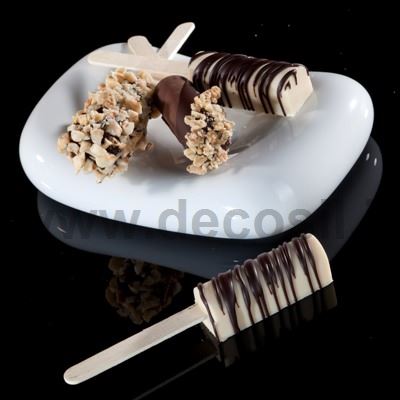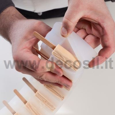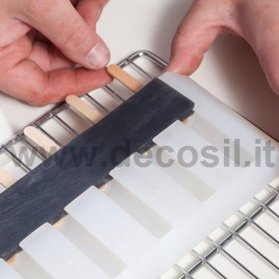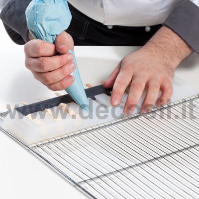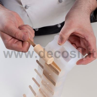 500g | Boil in a casserole the cream with the hazelnut paste, take out from the fire, add up and melt the beforehand softened jelly; add up the chocolate and let it melt. Emulsify the mixture with a mixer and cool down at 30° C. In the meantime prepare decoStick mould, place the lock on the base, insert supports making them slide until the end of the lock, insert them only for few millimeters into the mould. Whip the cream maintain it creamy, mix the cooled down composed and pour in decoStick moulds, with pastry bag fill the moulds making well adhere the composed to the moulds walls, and let slightly come out. Drive inside the support until about half of the mould lenght, with a spatula in parallel of mould, push the composed inside the mould, tilting the spatule, level the mould removing the excess. Cover with Ideabrill® paper or baking paper, put in the blast chiller at -40° C until the complete product hardening. When the product il well cooled down, remove the baking paper, remove the lock from the base, and demould. Decorate as you wish. |